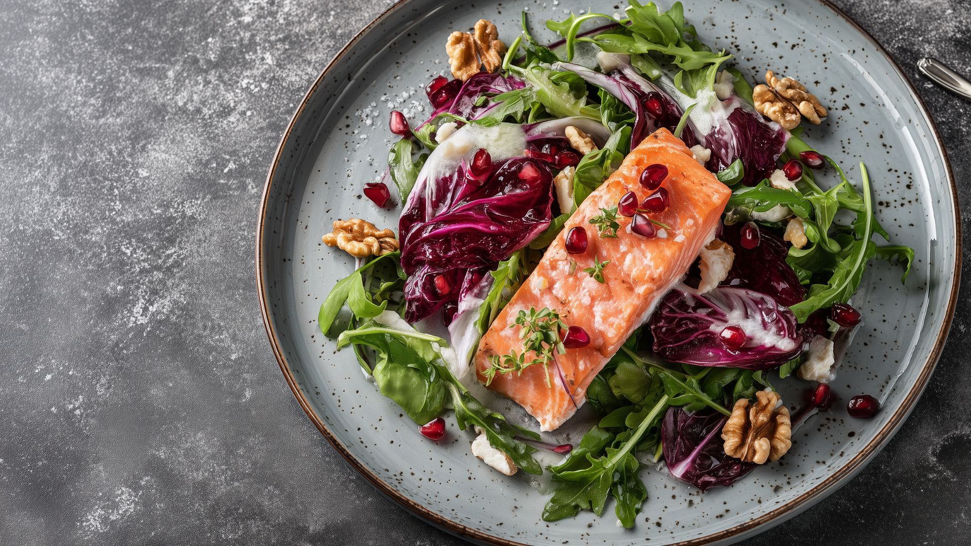 Wild Salmon, & Walnut Salad with Pomegranate