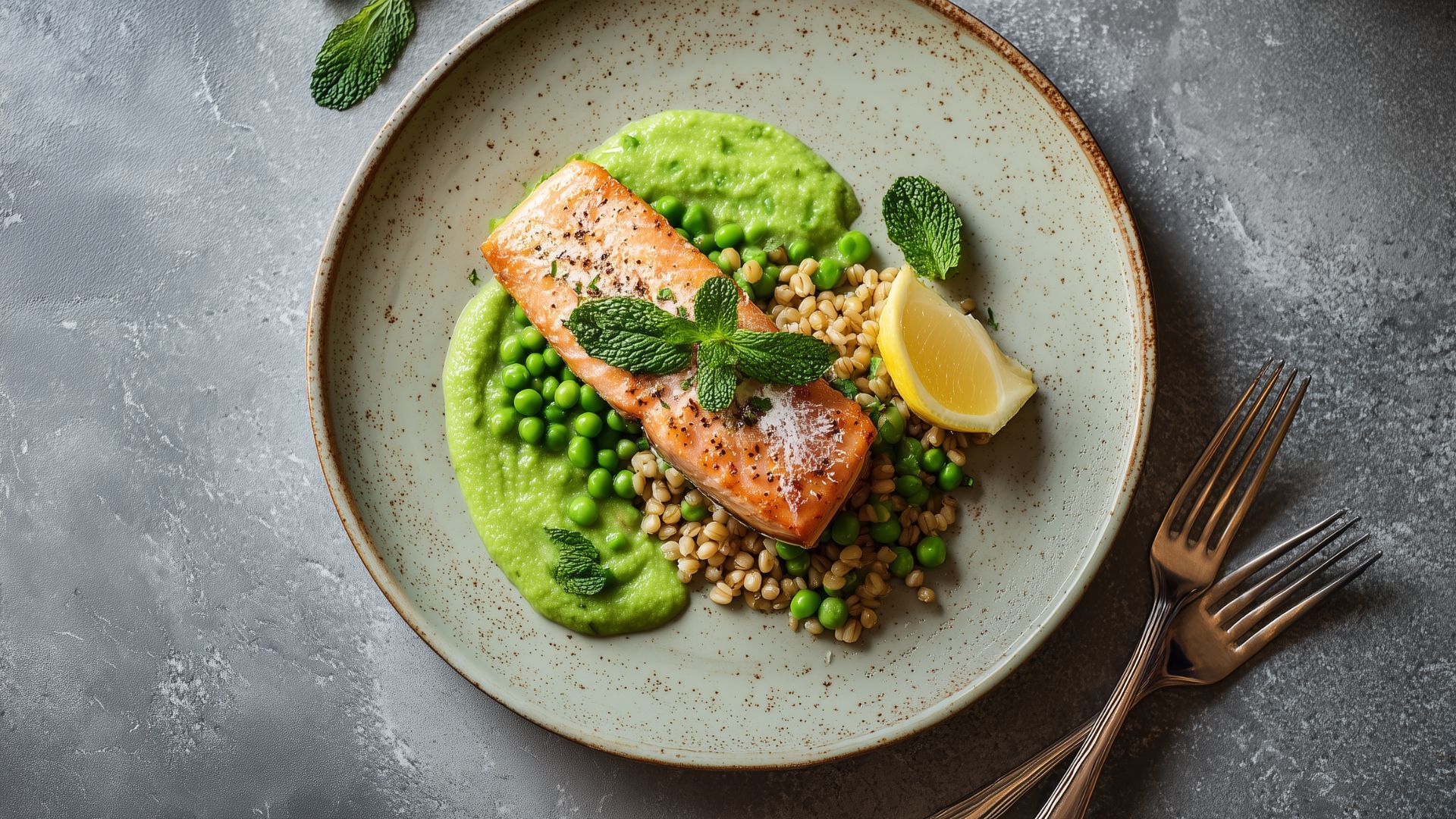 Baked trout With Pea, Mint & Lemon Puree & Barley